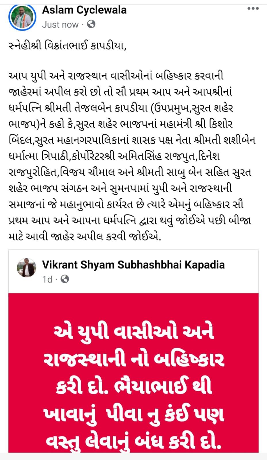 હકીકતમાં ઉત્તર પ્રદેશ અને રાજસ્થાનમાં ભાજપના નબળા પ્રદર્શન બાદ સુરત શહેર ભાજપ ઉપાધ્યક્ષ તેજલબેન કાપડિયાના પતિ વિક્રાંત શ્યામ કાપડિયાએ ફેસબુક પર UP અને રાજસ્થાનના લોકોનો બહિષ્કાર કરવાની અપીલ કરતી વિવાદિત પોસ્ટ લખી છે. આ પોસ્ટમાં બંને રાજ્યના લોકોનો બહિષ્કાર કરવાનું કહીને તેમની પાસેથી કોઈ ખાવા-પીવાનું કે વસ્તુ ન ખરીદવા તેઓ પોસ્ટમાં કહે છે. જેને કોંગ્રેસના નેતા અસ્લમ સાઈકલવાળાએ વાઈરલ કરી છે અને કહ્યું છે કે, પહેલા સુરત ભાજપમાં રહેલા ઉત્તર પ્રદેશ અને રાજસ્થાનના નેતાઓનો બહિષ્કાર કરો પછી બીજા માટે આવી જાહેર અપીલ કરવી જોઈએ.