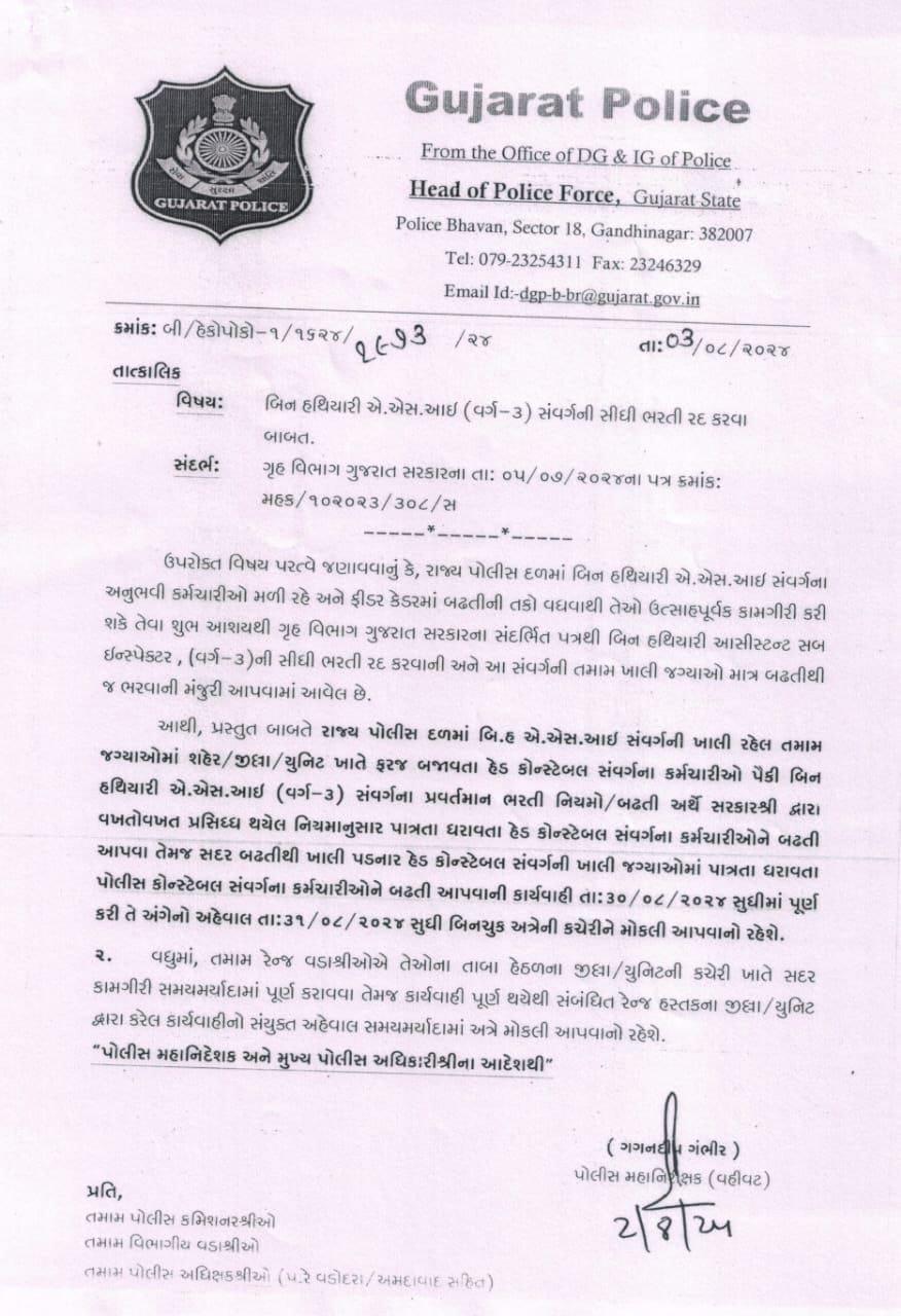આ પરિપત્રમાં જણાવવામાં આવ્યું છે કે, રાજ્ય પોલીસ દળમાં બિન હથિયારી ASI સંવર્ગના અનુભવી કર્મચારી મળી રહે અને ફીડર કેડરમાં બઢતીની તકો વધવાથી તેઓ ઉત્સાહપૂર્વક કામગીરી કરી શકે તેવા શુભ આશયથી ગૃહ વિભાગ ગુજરાત સરકારના સંદર્ભિત પત્રથી બિન હથિયારી આસીસ્ટન્ટ સબ ઈન્સ્પેક્ટર, વર્ગ 3ની સીધી ભરતી રદ કરવાની અને આ સંવર્ગની તમામ ખાલી જગ્યાઓ માત્ર બઢતીથી ભરવાની મંજૂરી આપવામાં આવી છે.
