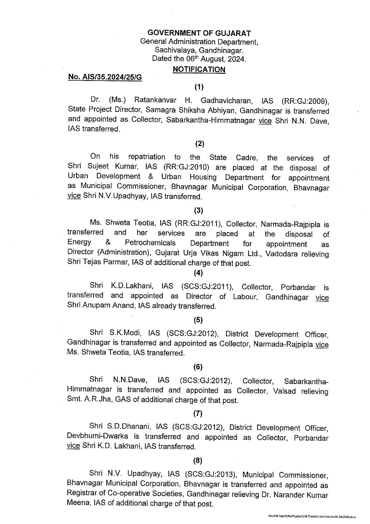 આ સાથે જ શ્વેતા તિઓટીયાની ગુજરાત ઉર્જા વિકાસ નિગમના ડાયરેક્ટર (એડમિનિસ્ટ્રેશન) તરીકે નિમણૂક કરવામાં આવી છે. તો એસ.કે. મોદીને નર્મદાના કલેક્ટર અને એન.એન. દવેને વલસાડના કલેક્ટર નીમવામાં આવ્યા છે. એસ.ડી. ધાનાણીને પોરબંદરના કલેક્ટર બનાવવામાં આવ્યા છે.