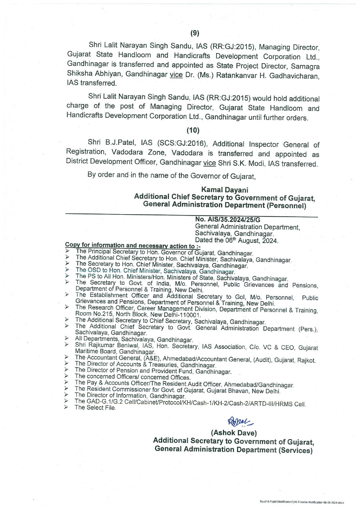 કે.ડી. લાખાણીની લેબર ડાયરેક્ટર તરીકે નિયુક્તિ કરવામાં આવી છે. એન.વી.ઉપાધ્યાયને કો-ઓપરેટિવ સોસાયટીના રજિસ્ટ્રાર બનાવવામાં આવ્યા છે. લલિત નારાયણસિંઘની સમગ્ર શિક્ષા અભિયાનના પ્રોજેક્ટ ડાયરેક્ટર તરીકે નિયુક્તિ કરવામાં આવી છે. આ ઉપરાંત તેમની પાસે ગુજરાત સ્ટેટ હેન્ડલૂમ અને હેન્ડિક્રાફ્ટ્સ ડેવલપમેન્ટના એમ.ડી. તરીકેનો વધારાનો હવાલો પણ રહેશે. બી.જે. પટેલને ગાંધીનગરના વિકાસ કમિશનર બનાવવામાં આવ્યા છે.