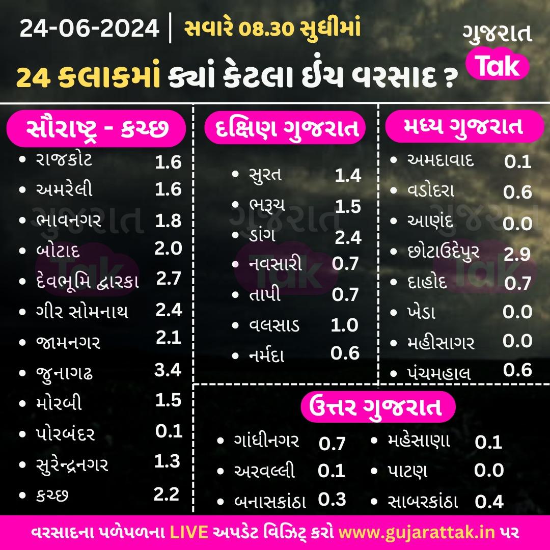 - 02:09 PM • 24 Jun 2024Weather Updates: 24 કલાકમાં ક્યાં કેટલા ઇંચ વરસાદ?