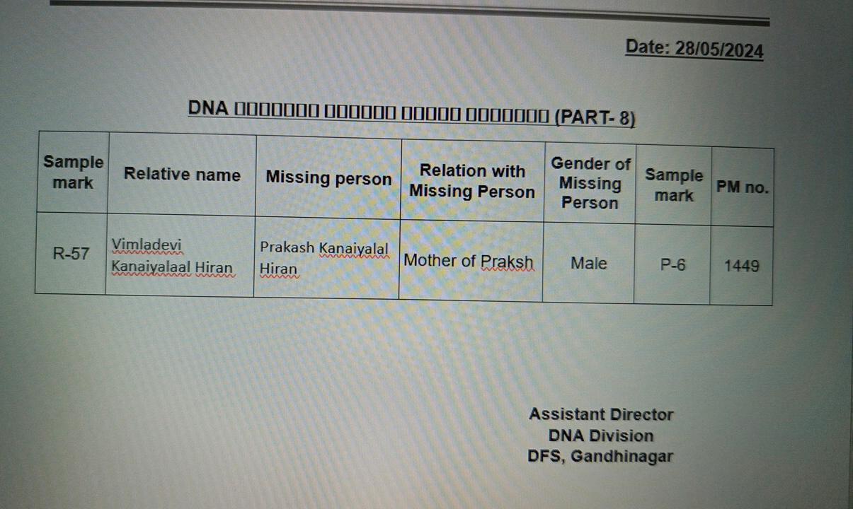 આગ લાગી તે સમયે પ્રકાશ હિરેન પણ સીસીટીવીમાં પણ કેદ થયો હતો. સવારે પ્રકાશ જૈનના ભાઈ જિતેન્દ્ર હિરેને પોલીસમાં અરજી કરી હતી. તેમણે કહ્યું કે આગની ઘટના બાદ પરિવાર સાથે કોઈ સંપર્ક નથી, તમામ ફોન નંબર પણ સ્વીચ ઓફ છે, પ્રકાશની કાર પણ ઘટના સ્થળે મળી આવી હતી. પ્રકાશના ભાઈની અપીલ પર પરિવાર પાસેથી DNA લેવામાં આવ્યું હતું. મૃતદેહના અવશેષોમાંથી કોઈ પ્રકાશના છે કે કેમ તે માટે DNA ટેસ્ટિંગ પણ કરવામાં આવ્યું હતું.